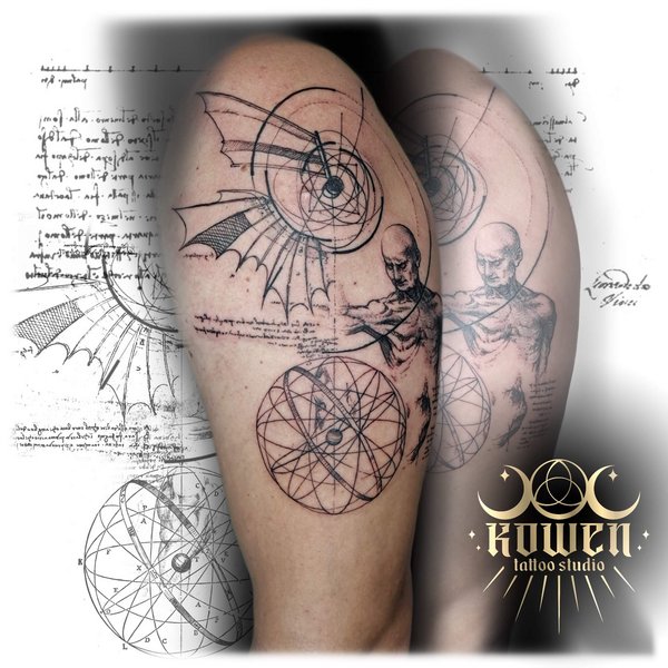 Łącząc renesansową sztukę z nowoczesnym tatuatorskim rzemiosłem, ten tatuaż oddaje idealną równowagę między historią a współczesną ekspresją. Fuzja mechaniki, anatomii i geometrii przemawia do niegasnącej ciekawości i ambicji, które definiują postęp ludzkości. To coś więcej niż tylko ozdoba ciała – to hołd dla ponadczasowej gry między nauką a kreatywnością, idealny dla tych, którzy traktują swoje ciało jako płótno intelektualnej i artystycznej ekspresji.
