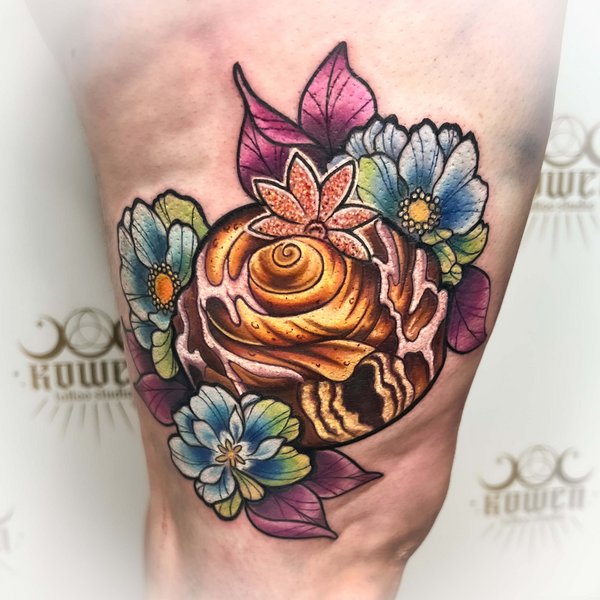 Ten zachwycający tatuaż to mistrzowska fuzja słodyczy i makabrycznej sztuki. Na pierwszy rzut oka bogate, złote tony cynamonowego bułeczki przyciągają uwagę, polewa, która nieoczekiwanie zmienia się w mroczny, upiorny kształt. Otoczony delikatnymi kwiatami i żywymi liśćmi, tatuaż balansuje pomiędzy przyjemnościami życia a przemijającą naturą istnienia. Skomplikowane detale, wyraziste kolory i mistrzowskie cieniowanie sprawiają, że ten projekt wyróżnia się, łącząc sztukę inspirowaną jedzeniem z ciemną, surrealistyczną estetyką.