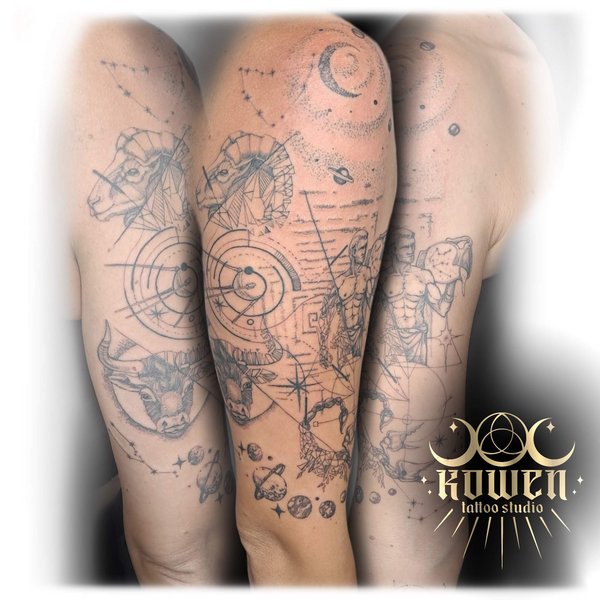 W sercu tego projektu znajdują się symbole zodiaku, ściśle powiązane z astrologią i ludzką mitologią. Byk i Baran są wyeksponowane, symbolizując siłę, determinację i indywidualność. Otaczają je elementy kosmiczne—planety, konstelacje i orbity—reprezentujące ogrom wszechświata. Postaci mitologiczne dodają warstwy narracyjnej, łącząc starożytne motywy z nowoczesną estetyką. Ten tatuaż symbolizuje harmonię między kosmosem a osobistą tożsamością, celebrując związek, który jest zarówno uniwersalny, jak i głęboko indywidualny.