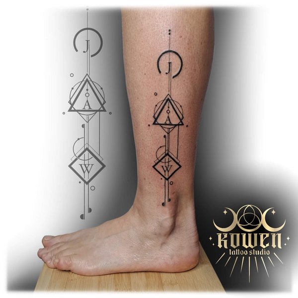 Ten geometryczny tatuaż to doskonałe połączenie symetrii, precyzji oraz osobistej symboliki. Jego wertykalna kompozycja, umieszczona wzdłuż dolnej części nogi, podkreśla naturalne linie ciała, nadając całości dynamiczny i harmonijny wygląd. Wzór składa się z przenikających się figur geometrycznych, subtelnych linii oraz delikatnych elementów dotworku, które nadają projektowi nowoczesny, minimalistyczny charakter. Niezależnie od tego, czy jest to czysto artystyczna forma, czy też kryje się za nią głębsze znaczenie, tatuaż ten ucieleśnia równowagę, porządek i intencjonalny design.