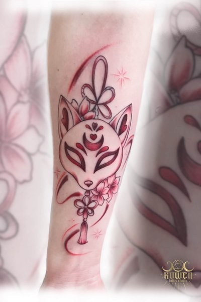 Ten urzekający tatuaż oddaje mistyczny urok japońskiego folkloru, przedstawiając maskę kitsune – magicznego lisa – jako duchowy symbol ochrony, mądrości i kobiecej siły. Doskonale umieszczony na przedramieniu, projekt łączy tradycyjną japońską symbolikę z nowoczesnym podejściem do sztuki tatuażu. Paleta barw oparta na delikatnym różu i czerwieni dodaje kompozycji romantycznej, eterycznej atmosfery, sprawiając, że tatuaż emanuje spokojem i mocą zarazem. To dzieło dla tych, którzy szukają połączenia duchowego znaczenia z artystycznym pięknem.
