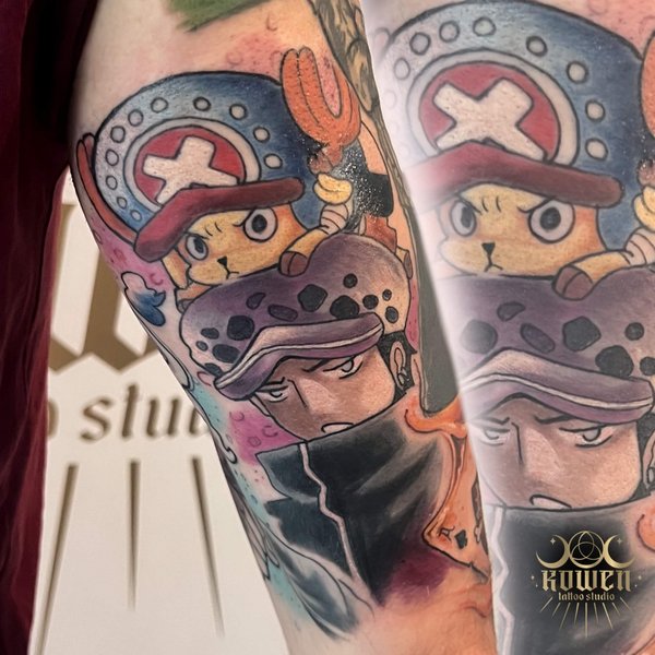 Ten żywy tatuaż w stylu anime ożywia dwie z najbardziej ukochanych postaci z One Piece: Tony'ego Tony Choppera oraz Trafalgara Lawa. Mistrzowsko wykonany z użyciem intensywnych kolorów i dynamicznego cieniowania, projekt oddaje esencję postaci w sposób, który jest zarówno potężny, jak i figlarny. Umieszczony w widocznym miejscu na ramieniu, tatuaż przyciąga wzrok i stanowi prawdziwy hołd dla ducha przygody fanów One Piece.