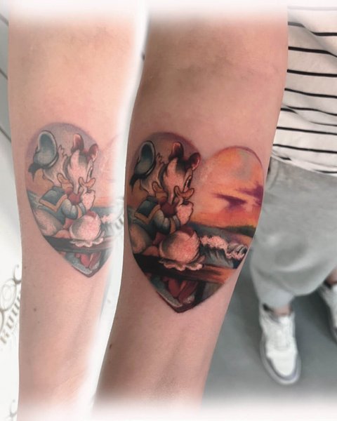 Ten tatuaż jest świętowaniem miłości, wspomnień i nostalgii, łącząc w sobie radość dzieciństwa z romantyzmem zachodu słońca. Kształt serca wzmacnia emocjonalne przesłanie, czyniąc projekt idealnym dla osób, które chcą nosić na skórze symbol czułości i spokojnych chwil. Połączenie intensywnej kolorystyki neo-traditional i uroku klasycznej animacji Disneya sprawia, że tatuaż jest ponadczasowy i pełen emocji, trafiając zarówno do miłośników sztuki, jak i fanów Disneya.