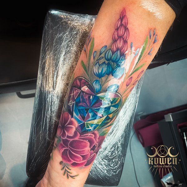 Duży, kobiecy tatuaż na przedramieniu, przedstawiający kryształ w kształcie serca, otoczony kwiatami. Tatuaż w stylu graficznym, ożywiony realistycznymi kolorami, przedstawia wyraziste serce wypełnione burzą barw, otoczone delikatnymi różowo-niebieskimi kwiatami.