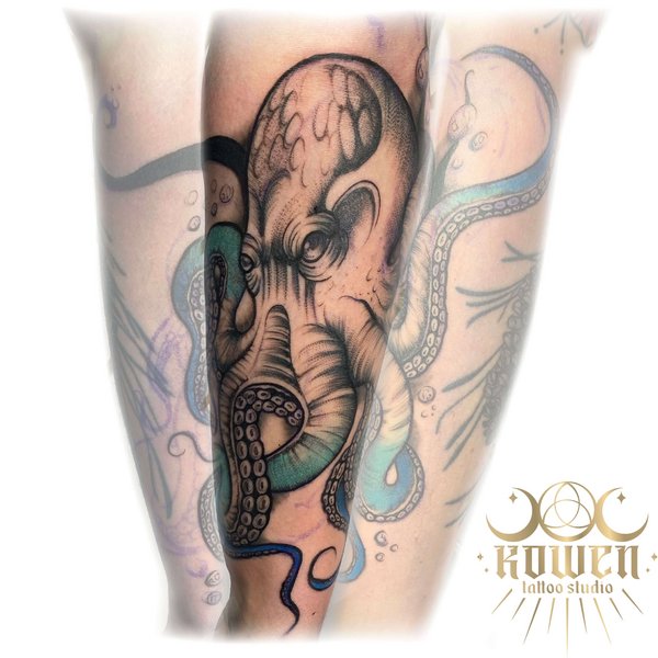 Duży tatuaż ośmiornicy umieszczony na przedramieniu, który mimo swoich rozmiarów emanuje kobiecą delikatnością i urokiem.
