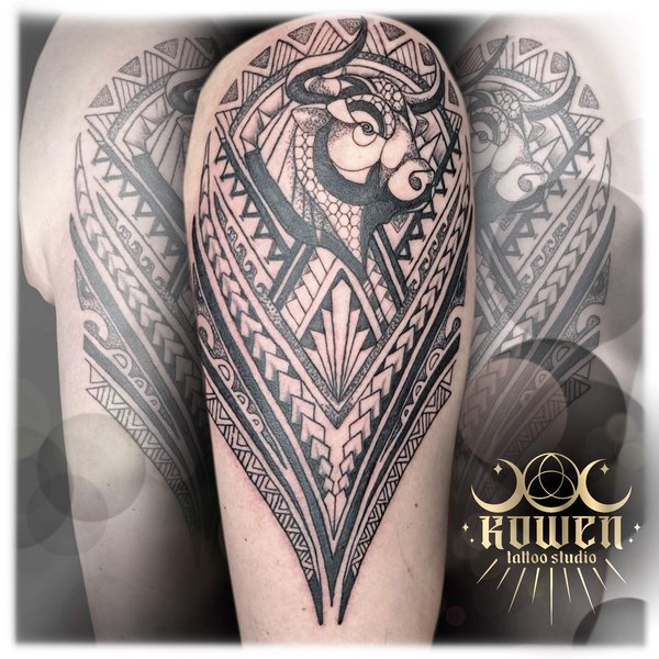 W centrum kompozycji znajduje się stylizowana głowa byka - symbol siły, wytrwałości i znaku zodiaku Byka. To właśnie ten element nadaje tatuażowi ciężar symboliczny i narracyjny. Otaczające go geometryczne wzory - trójkąty, chevrony, motywy plecionkowe - nawiązują do tradycyjnych języków ornamentu, wnosząc znaczenia ochronne i rytmiczną energię. W efekcie wzór łączy w sobie mistycyzm, rytuał i potęgę.