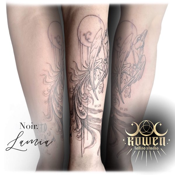 Ten tatuaż to mistrzowskie połączenie elegancji, tajemnicy i misternych detali. Płynnie układający się wzdłuż nogi wzór oddaje ruch i lekkość, tworząc projekt, który harmonizuje z naturalnymi konturami ciała. Motyw mitycznego ptaka splecionego z wirującymi ornamentami emanuje eterycznym urokiem, będąc jednocześnie śmiały i subtelny. To nie tylko dzieło sztuki na ciele, ale także symbol osobistego znaczenia i artystycznej finezji.