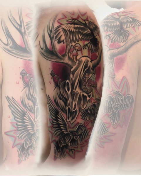 W centrum kompozycji znajduje się Leszy – pan lasu i opiekun dzikiej przyrody, przedstawiony z czaszki jelenia jako twarzy oraz okazałym porożem, które wieńczy jego głowę niczym korona leśnego króla. Wokół niego krążą kruki, posłańcy i strażnicy, których rozpostarte skrzydła tworzą aurę ochrony i mistycyzmu. Ich obecność podkreśla wiąź Leszego ze zwierzętami i duchami lasu. Wplecione w kompozycję organiczne ornamenty i falujące linie łączą wszystkie elementy w mistyczną całość, stanowiąc hołd dla słowiańskich mitów i duchowości natury. Projekt podąża naturalną linią ramienia, tworząc mocny element rękawa (sleeve), który przemienia ramię w świątynię pradawnej mądrości lasu.