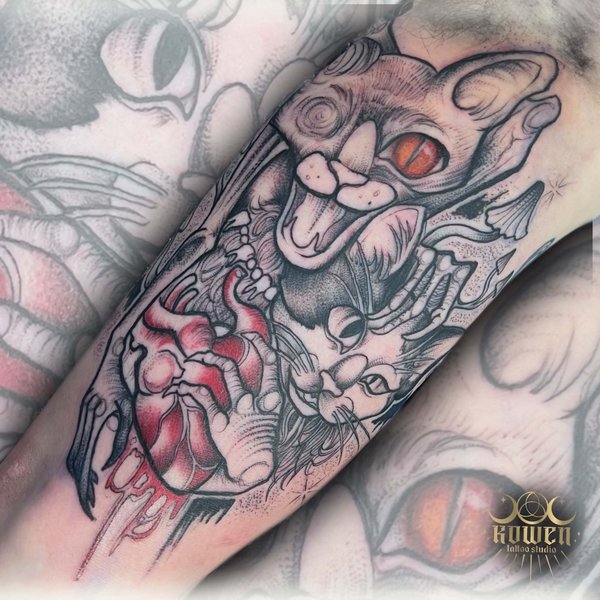 W sercu tego projektu leży podwójna natura kotów – zarówno jako symbole tajemnicy i niezależności, jak i dzikie, nieprzewidywalne siły. Liczne twarze kotów splecionych z kośćmi i ścięgnami sugerują motywy przemiany, pierwotnych popędów i surowych emocji. Centralna dłoń trzymająca serce wywołuje skojarzenia z posiadaniem, miłością, a być może także szaleństwem, czyniąc ten tatuaż głęboko osobistym wyrazem pasji, kontroli i dzikiej natury, która tkwi w nas wszystkich.