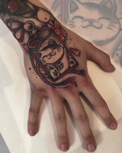Połączenie japońskiej symboliki szczęścia z europejskimi elementami dekoracyjnymi tworzy wyjątkowe dzieło, które przekracza granice kulturowe, zachowując jednocześnie ich głębię i znaczenie. Styl neotradycyjny pozwala na bogate zdobienia, które podkreślają wdzięk i duchowy charakter Maneki Neko, a ornamenty podnoszą kota do rangi świętego talizmanu. Ten styl sprawdza się doskonale, bo łączy prostotę przekazu z artystyczną złożonością, a śmiała lokalizacja na dłoni zamienia tatuaż w coś więcej niż ozdobę – w symbol ochrony i intencjonalnej mocy. To idealna propozycja dla miłośników kulturowych znaczeń, mocnych kompozycji i ponadczasowej symboliki szczęścia, uchwyconej w wybitnym stylu.