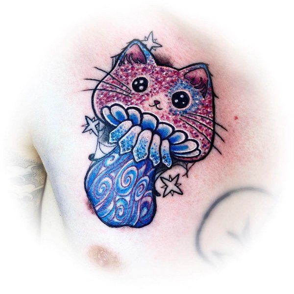 Tatuaż mały umieszczony na klatce piersiowej, poniżej obojczyka, przedstawiający kotka- podgrzybka. Tatuaż wykonany został w stylu neotradycyjnym z brokatowymi, realistycznymi wykończeniami. Różowy i niebieski kolor dodaje wzorowi jeszcze wiecej słodkości!