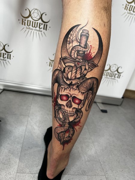 Ten tatuaż zajmujący całą tylną część łydki jest pełen symboliki i głębi, z wyraźnym naciskiem na mroczną estetykę i odważną wizję. Wykonany został w stylu newschool (neotradycyjnym) czarnym, z elementami dotworku i fineline.