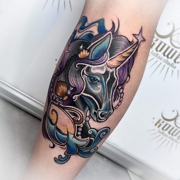 Wykonany w stylu neotradycyjnym, tatuaż łączy wyraziste kontury z miękkim cieniowaniem i subtelnymi gradientami kolorów. Projekt zachwyca bogatymi odcieniami niebieskiego, fioletowego i złotego, dodając głębi i intensywności. Styl ten znany jest z detalicznego zdobnictwa, dzięki czemu każdy element—od płynącej grzywy jednorożca po delikatne muszle—zachwyca elegancją i wyrafinowaniem.