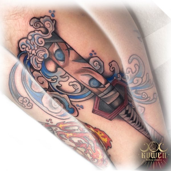 Tatuaż średniej wielkości umieszczony na łydce. Przedstawia odbicie oczu w mieczu, jednego z głownych bohaterów anime Demon Slayer. Tatuaż został wykonany w kolorowym stylu neotradycyjnym, graficznym.