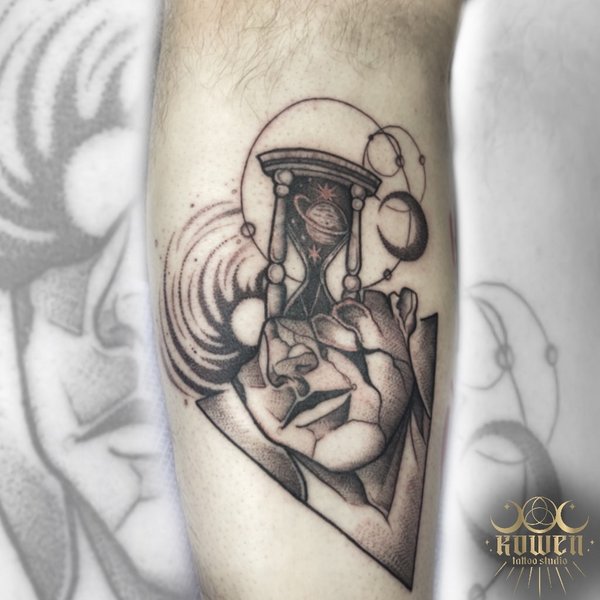 Tatuaż średniej wielkości wykonany na przedramieniu. Przedstawia ludzką głowę, której połowa jest pęknięta i widać w niej kosmos i klepsydrę. Tatuaż został wykonany w stylu newschool, graficznym, i cieniowaniem typowym dla stylu sketch.