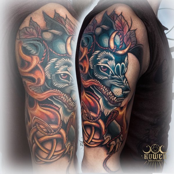 Duży tatuaż umiejscowiony na ramieniu. Przedstawia wilka, nad którego głową znajduje się księżyc, a za nim można zauważyć motywy roślinne. Na dole wzoru znajduje się Triquetr czyli Trójkąt Celtycki, opleciony liną, która pojawia się również w okolicach głowy wilka. To wyszstko stworzone zostało w stylu neotradycyjnym (newschool), uzupełnionym pięknym kolorowym wykończeniem. Dodatkowo z pyska zwierzęcia wydobywa się ogień, który otacza wiekszość wzoru,a został on wykonany w stylu realistycznym.