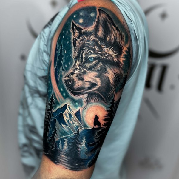 Tatuaż jest wykonany w stylu neotradycyjny, łączącym realistyczne detale z kreatywnym oświetleniem i gradientami kolorów. Ciemnoniebieskie i czarne tony lasu płynnie łączą się z żywymi światłami księżyca i śnieżnymi refleksami, tworząc głębię i atmosferę. Futro wilka zostało szczegółowo odwzorowane z drobną teksturą, podczas gdy otaczające elementy ożywiają precyzyjne cieniowanie i mieszanie kolorów.
