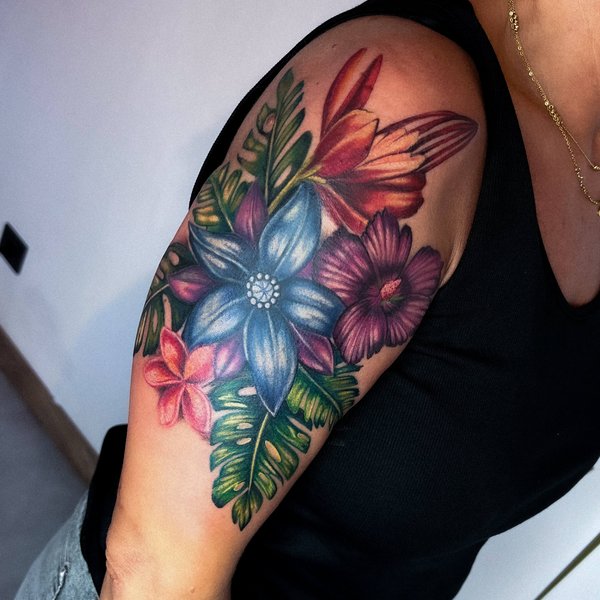 Ten oszałamiający tatuaż kwiatowy to zapierająca dech w piersiach kompozycja egzotycznych kwiatów i bujnej zieleni, tworząca żywą i dynamiczną kompozycję, która naturalnie rozciąga się na górnej części ramienia. Bogaty w kolory i detale, projekt uchwyca esencję tropikalnego raju, celebrując piękno i różnorodność natury. Umiejscowienie i kompozycja tatuażu sprawiają, że jest to idealny wybór dla tych, którzy chcą zaprezentować odważny, a zarazem elegancki kawałek sztuki ciała.