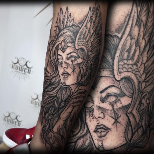 Ten oszałamiający tatuaż w odcieniach czerni i szarości przedstawia Walkirię—dziką i mitologiczną wojowniczkę z mitologii nordyckiej. Umieszczony na przedramieniu, projekt przyciąga wzrok swoimi skomplikowanymi detalami oraz odważnym cieniowaniem. Silny wyraz twarzy, ozdobiona fryzura i wyjątkowe detale sprawiają, że ten tatuaż to prawdziwe arcydzieło, wywołujące uczucie zarówno piękna, jak i siły.
