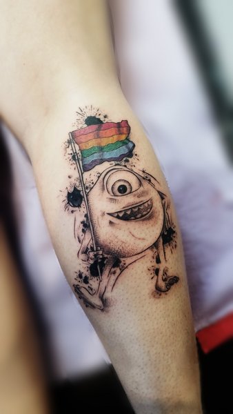 Tatuaż przedstawia znanego nam wszystkim sarkastycznego, charyzmatycznego i elokwentnego potwora w kształcie zielonej kuli z wielkim okiem i w tym wypadku, tęczową flagą w dłoni. Mike Wazowski to jeden z głównych bohaterów filmu "Potwory i Spółka" z 2001roku, wydanego przez wytwórnię Pixar. Tatuaż jest dość duży, umiejscowiony został na tylnej części łydki. Wzór został wykonany prawie w całości w czerniach, w stylu sketch(szkic). Flaga, którą trzyma Mike jest za to zrobiona w stylu realistycznym kolorowym. (Zastanawialiśmy się jak moglibyśmy zrobić tęczę w samej czerni, ale doszliśmy do wniosku, że to głupie).