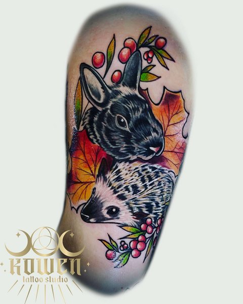 W centrum tego tatuażu znajdują się królik i jeż, dwa zwierzęta często kojarzone z ciekawością, delikatnością i wytrwałością. Królik, symbolizujący intuicję i zdolność adaptacji, oraz jeż, znany ze swojej ochronnej natury, tworzą znaczący duet. Otoczone jesiennymi liśćmi i jagodami, tatuaż ten wywołuje poczucie więzi z naturą i zmieniającymi się porami roku, czyniąc go idealnym wyborem dla tych, którzy znajdują inspirację w lesie i jego mieszkańcach.