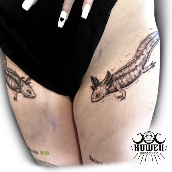 Dwa małe tatuaże na udach (pachwinach) przedstawiające Axolotle czyli ambystomy meksykańskie małe słodkie zwierzę, które w ostatnim czasie zdobywa coraz wiekszą liczbę fanów wsród miłośników terrarystyki i akwarystyki. Wzór został wykonany w stylu sketch, dotwork, delikatnie idące w realizm.