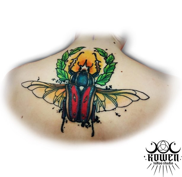 Według wierzeń Egipcjan chrząszcz jest symbolem nieśmiertelności. Posiadacz tego tatuażu jest hodowcą, więc zwracał uwagę na najmniejsze szczegóły.