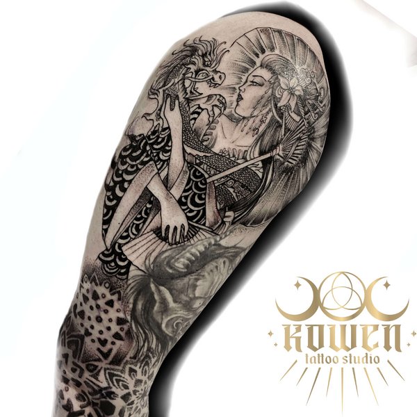Przedstawiona została na nim Gejsza trzymająca w rekach smoka. Całość tatuażu została utrzymana w czerniach w stylu graficznym delikatnie idącym w stronę stylu sketch. Tatuaż zamyknięty został delikatnymi liniami w stylu fineline ( linework), oraz podkreślony cieniowaniem.