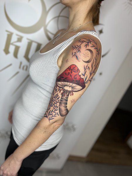 Duży grzyb z czerwonym kapeluszem został umieszczony w centrum tatuażu. Kapelusz jest dobrze zarysowany, z wyraźnymi detalami, aby podkreślić jego kształt i fakturę. Do tego zamiast kropek jak u typowego muchomora ten grzyb ma koronkowe wzory, co dodaje mu kobiecego wyglądu. Kwiaty i ksieżyc są rozmieszczone wokół grzyba, tworząc delikatną otoczkę, która dodaje mu delikatności i wrażliwości.