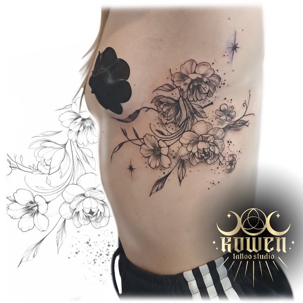 Tatuaż przedstawiający kwiaty i pnącza róży połączonej z nasturcją, otoczone przez gwiazdki nadające wzorowi kobiecości i ulotności. Tatuaż jest średniej wielkości, a znajduje się na żebrach. Wykonany jest delikatnie, stylem fine line, linework oraz dotwork, które świetnie współgrają ze sobą tworząc magiczny, florystyczny wzór.