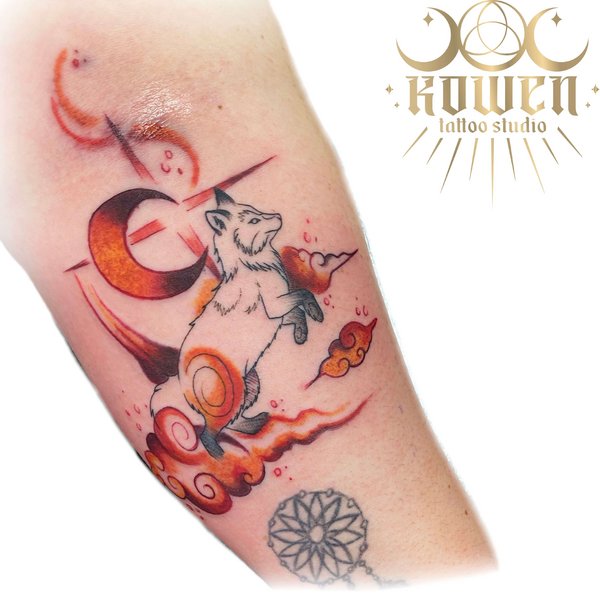 Mały tatuaż na przedramieniu, z motywem lisa unoszącego się w chmurach. Ten bajkowy tatuaż wykonany został w stylu linework, fineline, z pomarańczowymi wykończeniami w stylu watercolor.