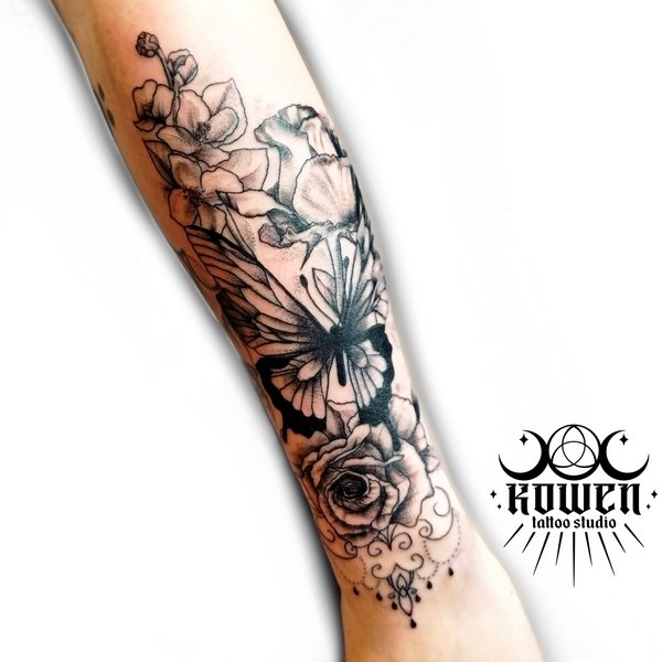 Duży tatuaż kobiecy na przedramieniu, w centralnym punkcie którego znajduje się piękny motyl.