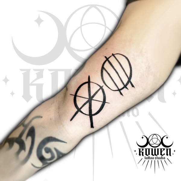 Tatuaż mały wykonany na dolnej częsci ramienia, z motywem symboli walki i siły. Całość tatuażu została wykonana w stylu graficznym, black work i nawiązuje do sztuki graffiti.