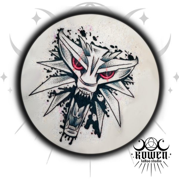 Tatuaż średniej wielkości wykonany na lewej piersi, z motywem z serii "Wiedźmin". Graficzny wzór z wyrazistymi, czarnymi kleksami, które nawiązują do estetyki graffiti. Wzór charakteryzuje się również realistycznymi, świecącymi na czerwono oczami. Tatuaż jest inspirowany zarówno symbolem szkoły wilka, reprezentującym wiedźminów, jak i symbolem samego Geralta z Rivii, głównego bohatera znanego cyklu Wiedźmin autorstwa Andrzeja Sapkowskiego.