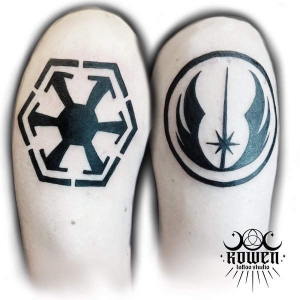 Dwa średniej wielkości tatuaże umieszczone na ramionach z symbolami z serii Star Wars w stylu graficznym, black work.