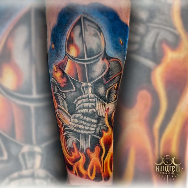Tatuaż ten to mistrzowskie połączenie realizmu z odważną ilustracyjną estetyką. Detalicznie odwzorowany pancerz ukazuje kunszt w cieniowaniu i podkreślaniu refleksów, co sprawia, że metaliczne powierzchnie nabierają życia. Płomienie wykonane są w stylu malarstwa cyfrowego – z płynnymi przejściami barw i intensywnymi tonami, które dodają kompozycji energii i dramatyzmu. Kontrast między chłodnymi tonami zbroi a ciepłem ognia jeszcze bardziej podkreśla siłę przekazu tatuażu.