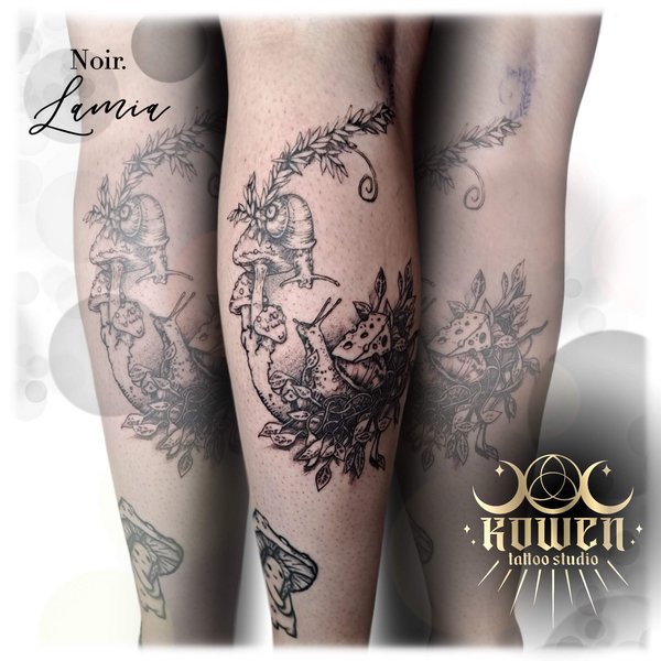 Tatuaż wykonany jest w technice fine blackwork z detalicznym dotworkiem, łącząc organiczny realizm z subtelnym surrealizmem. Precyzyjne linie nadają strukturę i formę, podczas gdy delikatne cieniowanie punktowe tworzy miękką głębię i fakturę, szczególnie w liściach i muszli ślimaka. Monochromatyczna paleta wzmacnia poczucie ponadczasowości i tajemnicy, czyniąc tatuaż niczym ilustrację z zapomnianej baśni lub dziennika przyrodnika-snu.